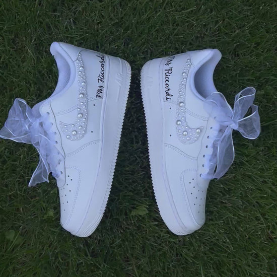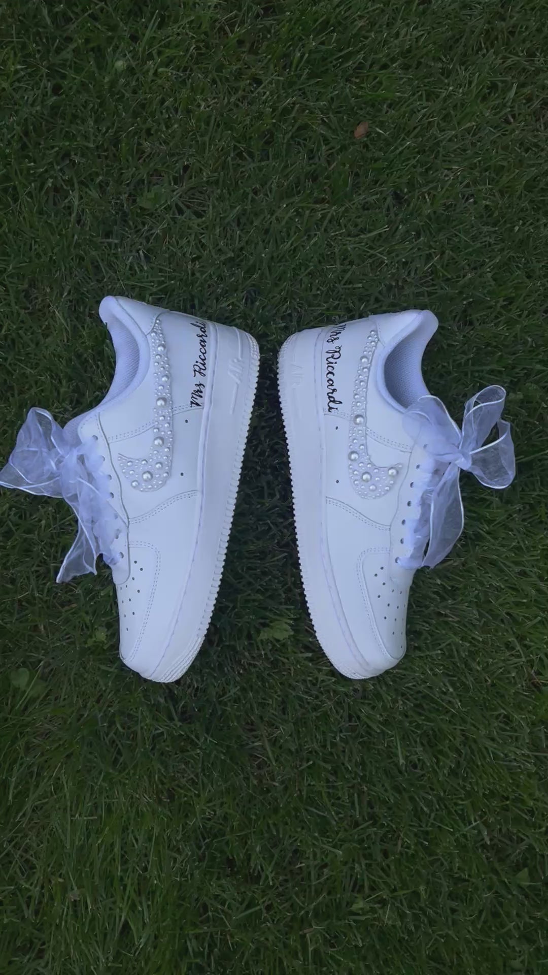 Step into our new favorites for your wedding day! These include the outside check mark covered in pearls, choice of shoe lace, and your future last name on the outside panel!
